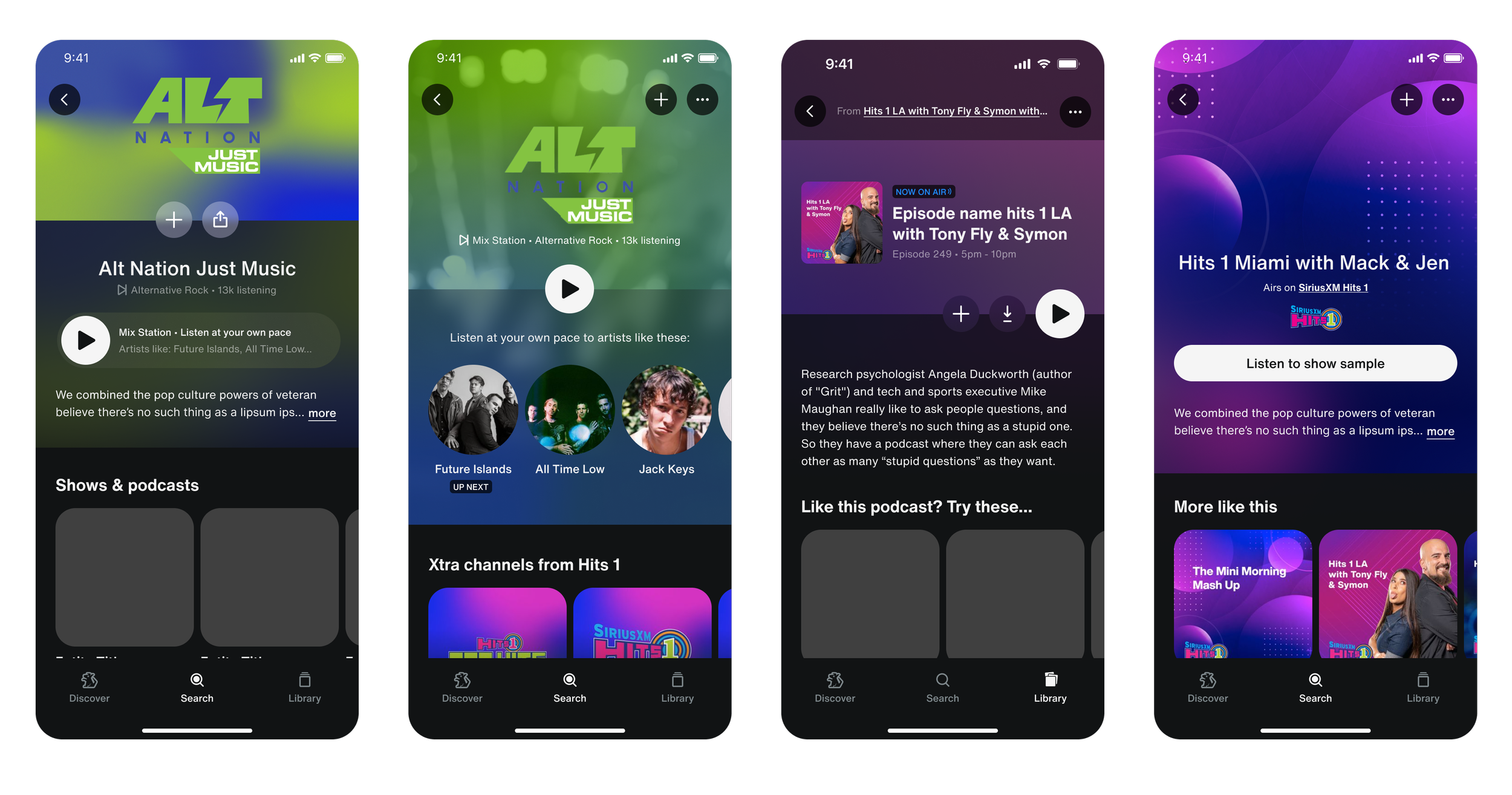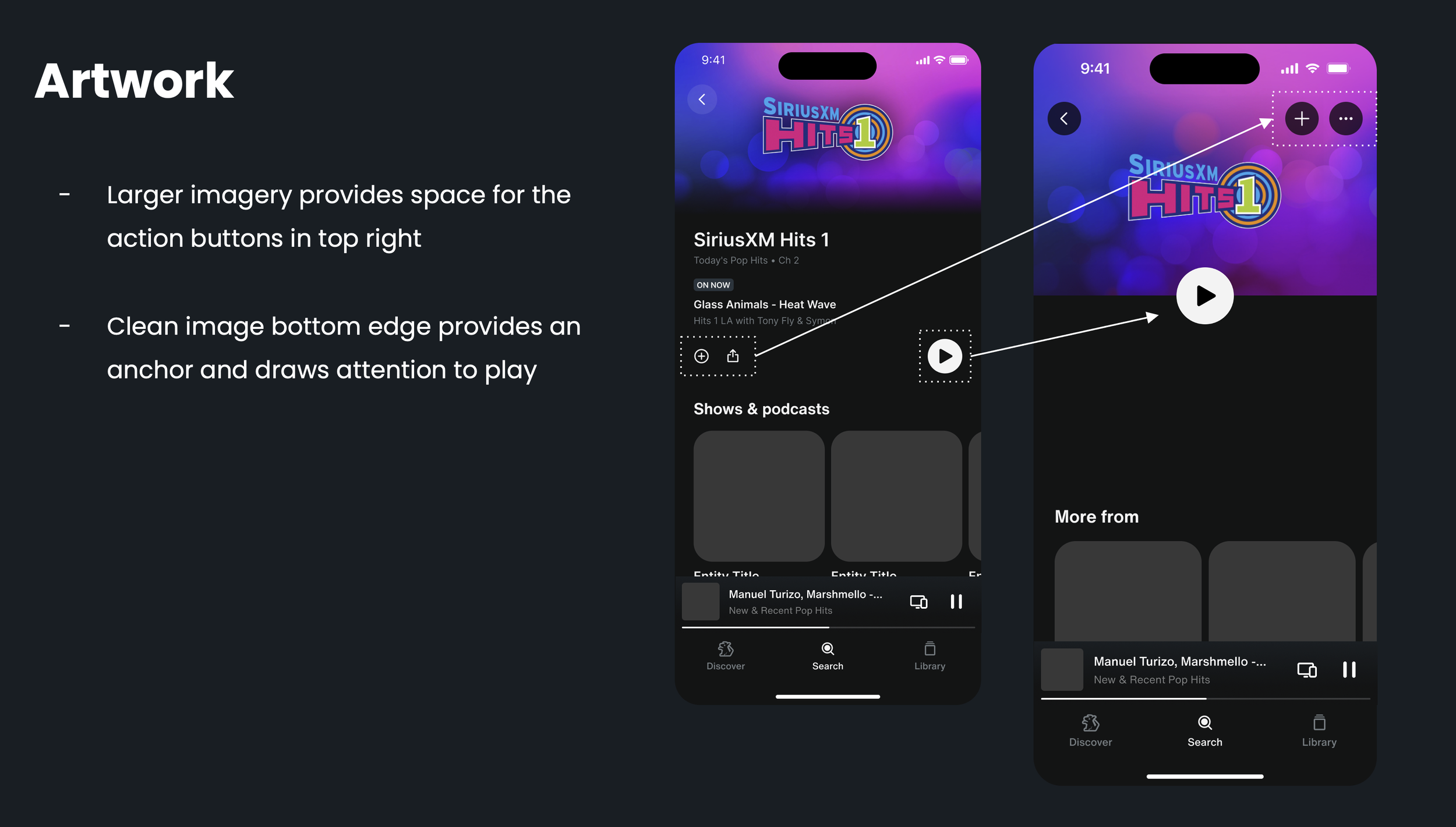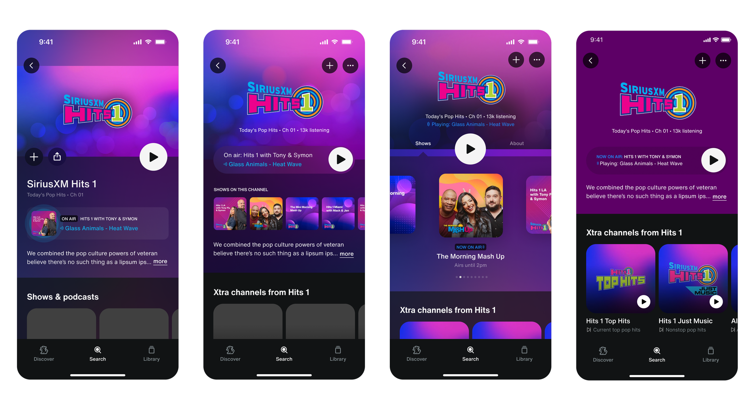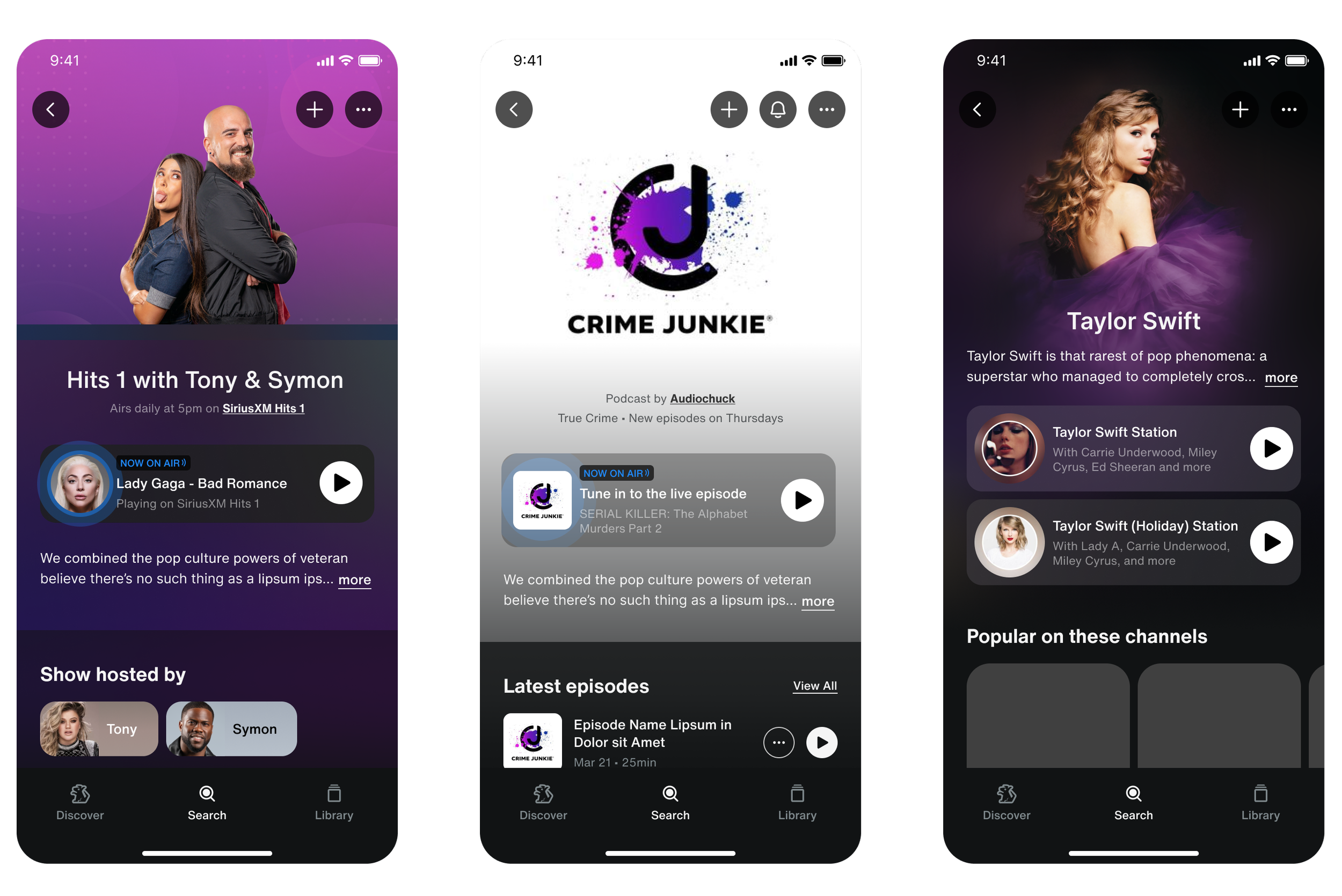 What looks like a simple page redesign was, in reality, a foundational rethink of how millions of users discover and engage with content across SiriusXM. I helped lead the redesign of entity headers across our 12 different entity page types (eg. channels, shows, artists, and episodes) — transforming a cluttered, monotonous system into a scalable, modular framework centered around playback and clarity. The project spanned dozens of design explorations, deep competitive analysis, and alignment across multiple layers of leadership, culminating in a vision we presented up to the VP level. The result was one of the most well-received launches in recent memory, praised internally for both its usability and visual polish, and validated through user testing as more intuitive, engaging, and action-driven.