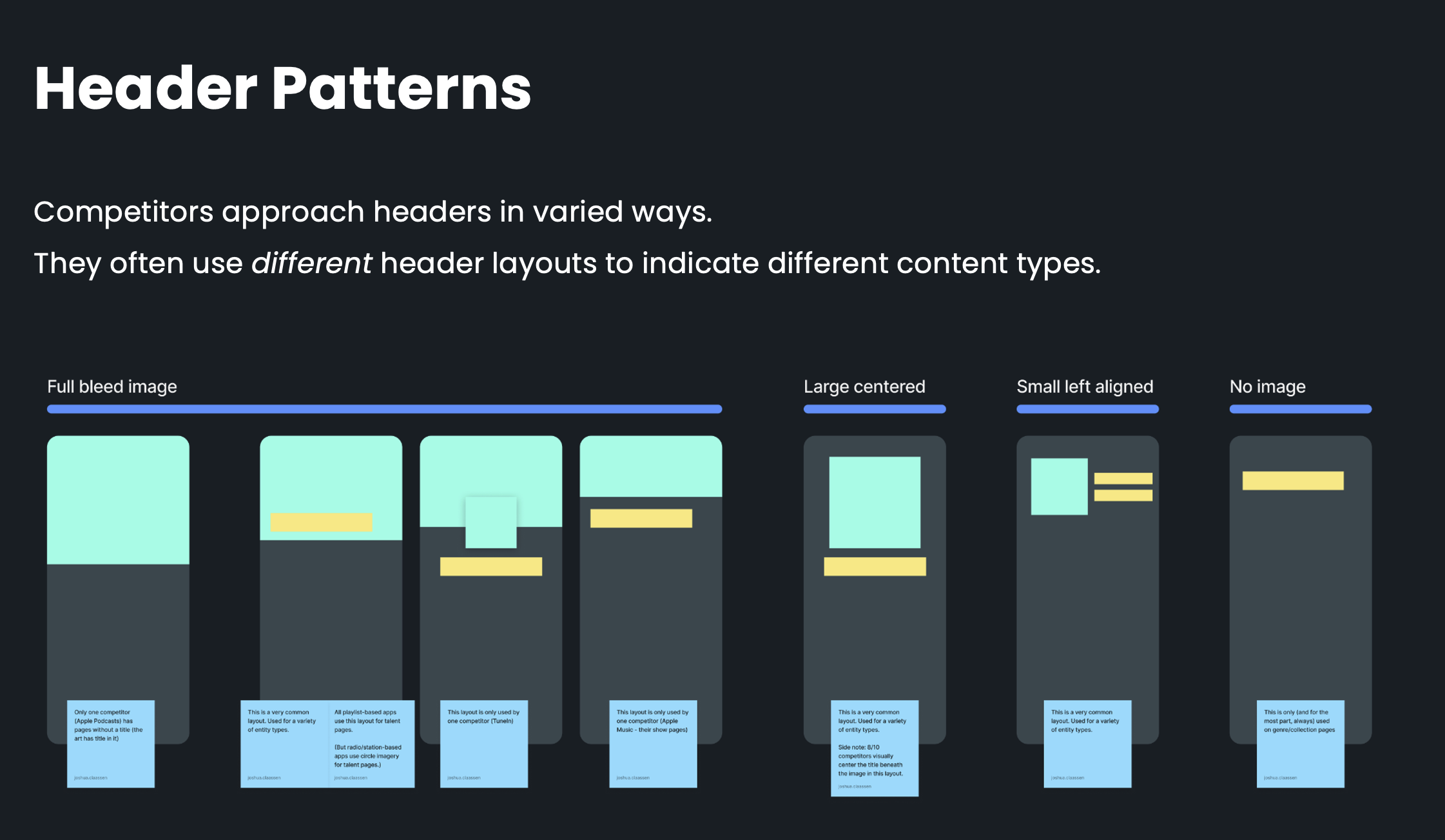 One of the most critical decisions was anchoring the header around a large, centered play button. While competitors varied widely in placement, our explorations showed that consistency and prominence mattered more than novelty. A centered play action created a clear focal point, reinforced the primary goal of the page, and scaled cleanly across entity types—even those without immediate playback.